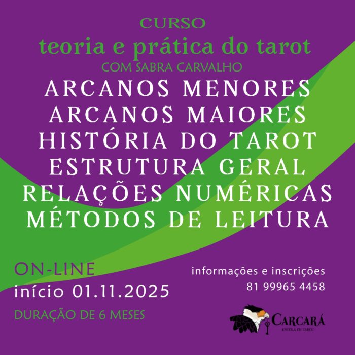 A Carcará – Escola de Tarot inicia no dia 01 de novembro de 2025 uma nova turma do Curso On-line de Teoria e Prática do Tarot. As aulas serão ministradas pela taróloga Sabrina Carvalho, durante seis meses, aos sábados pela manhã, das 10h30 às 12h.