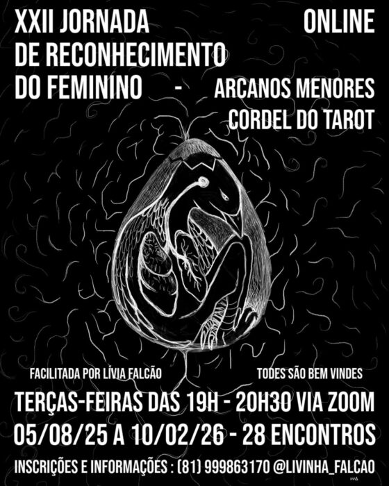 No dia 05 de agosto de 2025 tem início a XXII Jornada de Reconhecimento do Feminino, conduzida pela artista e terapeuta Lívia Falcão. Os encontros são on-line, com periodicidade semanal, sempre nas terças-feiras, das 19h às 20h30.