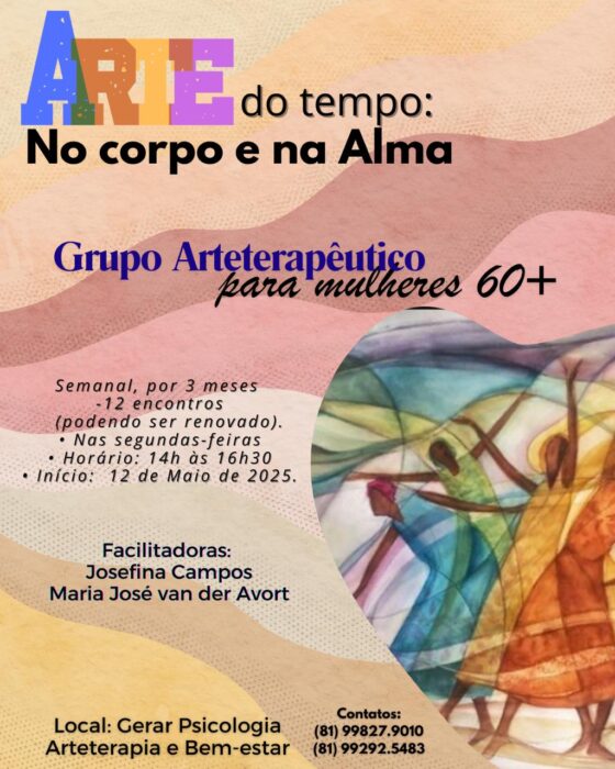 O Espaço Gerar, no Recife, promove a partir do dia 12 de maio de 2025 o grupo arteterapêutico para mulheres 60+ ‘Arte do Tempo: no corpo e na alma’, conduzido pelas arteterapeutas e psicólogas Josefina Campos e Maria José van der Avort.