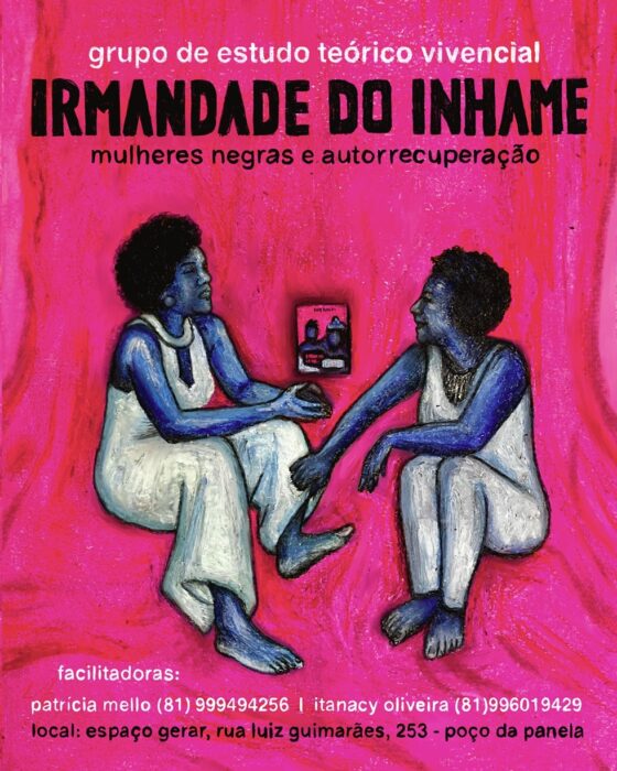 Qunizenalmente, nas quintas-feiras à noite, acontecem no Recife os encontros do grupo de estudos teórico-vivencial ‘Irmãs do Inhame: Mulheres Negras e Autorrecuperação’, conduzidos pela psicóloga Patrícia Melo e pela psicanalista Itanacy Oliveira. O grupo se reúne no Espaço Gerar, localizado no bairro do Poço da Panela. A participação é gratuita!