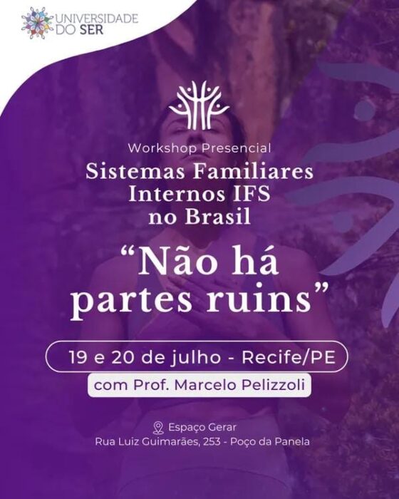 Estão abertas as inscrições para o Workshop Sistemas Familiares Internos (IFS) no Brasil, com o tema ‘Não há partes ruins’, conduzido pelo professor Marcelo Pelizzoli e promovido pela Universidade do Ser. O evento acontece nos dias 19 e 20 de julho, das 8h às 18h, no Espaço Gerar, localizado no bairro do Poço da Panela, no Recife.