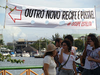 O “mote” da festa (agora vou chamar de festa) é a indignação do pessoal por conta do projeto Novo Recife, que – entre outras coisas – pretende subir 14 torres de 40 andares na beira do rio. Quem entende faz a lista da bronca: problemas de ventilação, saneamento e trânsito devem ser o efeito colateral do projeto, caso saia como o consórcio imobiliário deseja.O grupo que compareceu ao cais hoje foi significativo e fez ver que existe muita gente que acha importante uma discussão maior sobre o direito à cidade e sobre a forma com que se constrói ou se deixa de construir por aqui. Mas, enfim.