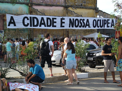 A grande graça de hoje foi ver pessoas na rua, dividindo esforços e conversas. Pessoas que, de uma forma ou de outra, percebem a necessidade de construir algo novo (eita) em termos de política na cidade. Pouco me importa se ainda tem gente se empoderando das discussões. Tou nem aí para quem vier me dizer que é improvável a interrupção do Projeto Novo Recife, que o terreno está comprado, que a prefeitura vai conceder todas as licenças, etc. Certamente a movimentação da galera vai aumentar o poder de barganha de possíveis gestores públicos interessados em aumentar as chamadas ‘contrapartidas sociais’ do empreendimento, mas nem é isso que eu tou aqui comemorando.